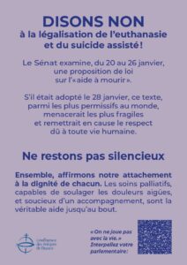 Le sénat examine du 20 au 26 janvier 2026 une proposition de loi sur l' »aide à mourir ». S’il était adopté le 28 janvier ce texte serait parmi les plus permissif au monde, menacerait les plus fragiles et remettrait en cause le respect dû à toute vie humaine .L’Eglise catholique en France, par la voix de ses évêques, ses associations de solidarité, et ses aumôniers agissant auprès des malades, n’a eu de cesse d’alerter sur la menace qui pèse sur les plus fragiles et sur la mise en question du respect dû à toute vie humaine.